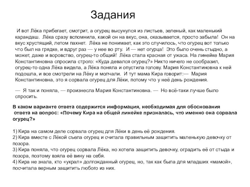 ответа на вопрос: «Почему Кира на общей линейке призналась, что именно она сорвала огурец?»