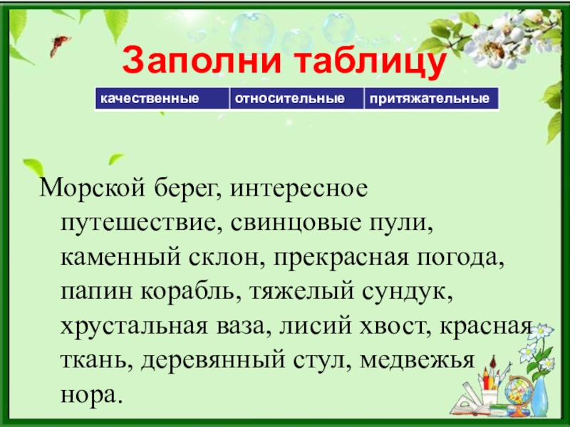 Заполни таблицуМорской берег, интересное путешествие, свинцовые пули, каменный склон, прекрасная погода, папин корабль, тяжелый сундук, хрустальная ваза,
