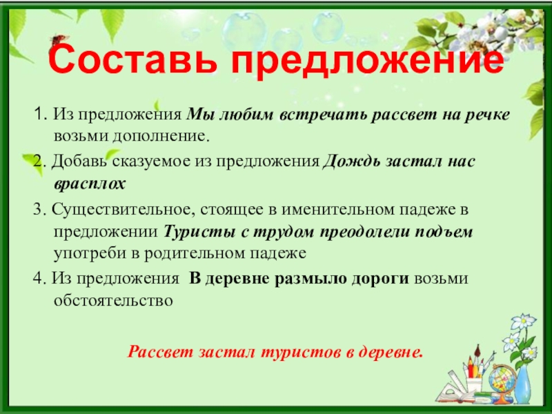 Составь предложение1. Из предложения Мы любим встречать рассвет на речке возьми дополнение.2. Добавь сказуемое из предложения Дождь