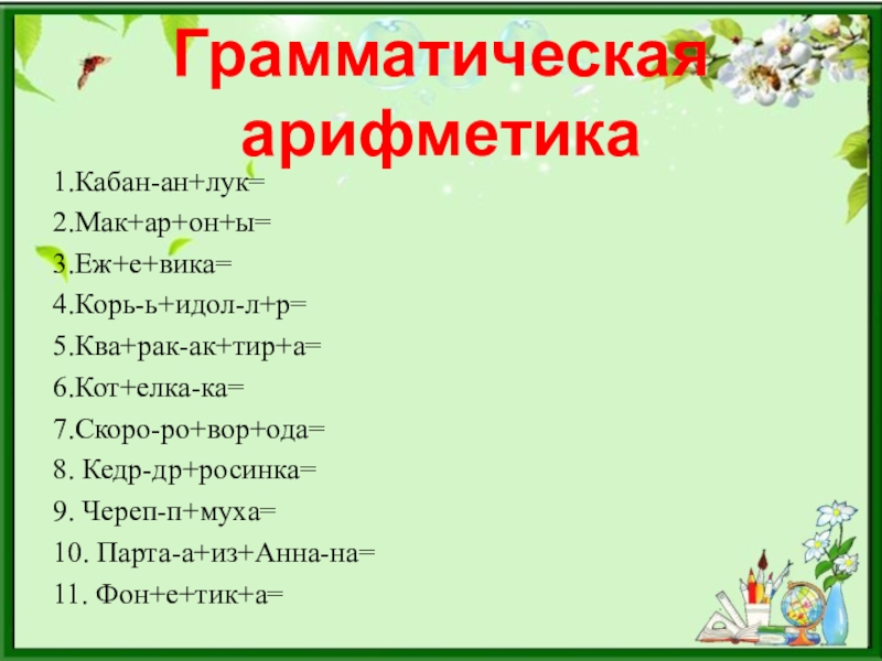 Грамматическая арифметика1.Кабан-ан+лук=2.Мак+ар+он+ы=3.Еж+е+вика=4.Корь-ь+идол-л+р=5.Ква+рак-ак+тир+а=6.Кот+елка-ка=7.Скоро-ро+вор+ода=8. Кедр-др+росинка=9. Череп-п+муха=10. Парта-а+из+Анна-на=11. Фон+е+тик+а=