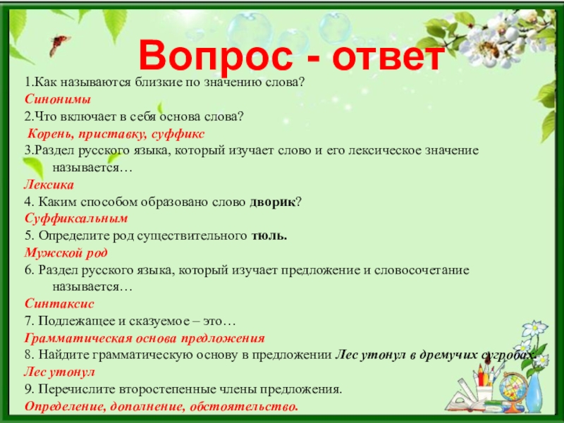 Вопрос - ответ1.Как называются близкие по значению слова? Синонимы2.Что включает в себя основа слова? Корень, приставку, суффикс3.Раздел