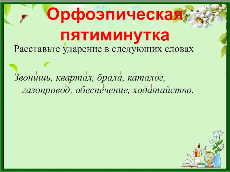Орфоэпическая пятиминуткаРасставьте ударение в следующих словахЗвонишь, квартал, брала, каталог, газопровод, обеспечение, ходатайство.
