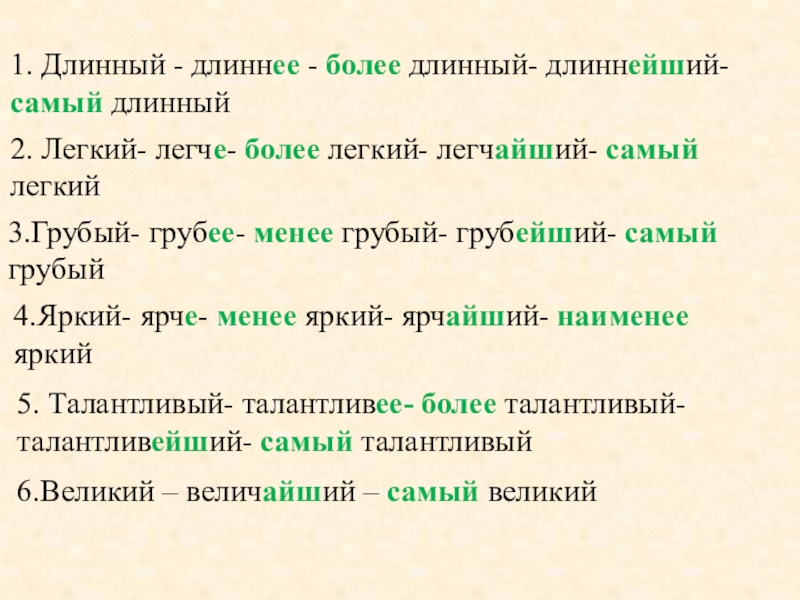 5. Талантливый- талантливее- более талантливый- талантливейший- самый талантливый