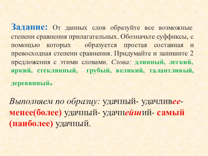 Выполняем по образцу: удачный- удачливее- менее(более) удачный- удачнейший- самый(наиболее) удачный.