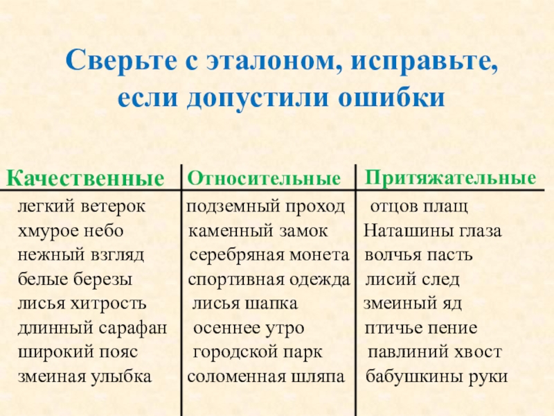 Легкий ветерок, подземный проход, отцов плащ, Наташины глаза, лисья шапка ,хмурое небо , каменный замок нежный взгляд , серебряная монета , спортивная одежда, волчья пасть, лисья шапка ,белые березы, лисий след, лисья хитрость, змеиный яд, осеннее утро, павлиний хвост, длинный сарафан птичье пение, широкий пояс, городской парк, змеиная улыбка, соломенная шляпа, бабушкины руки.