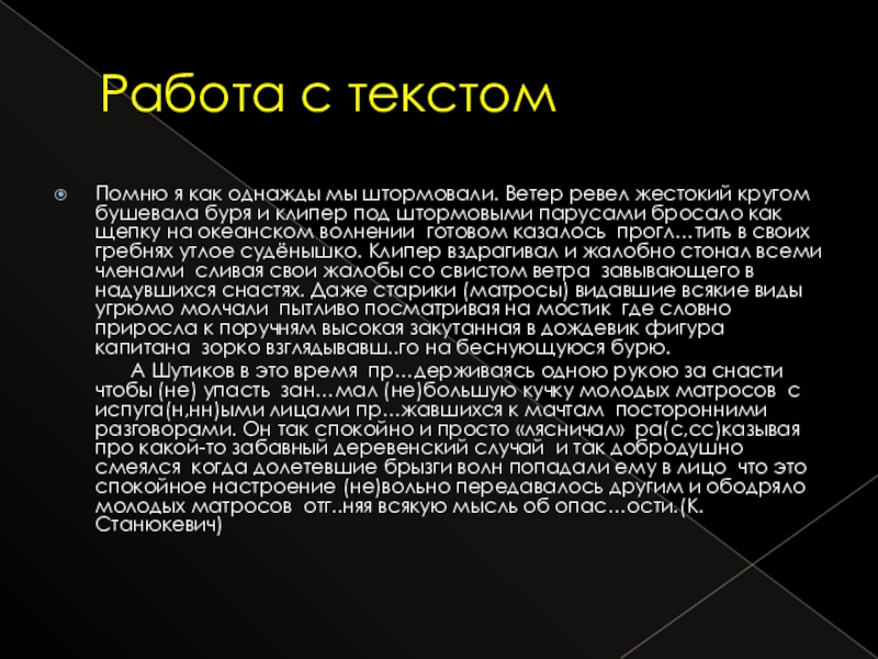 А Шутиков в это время пр…держиваясь одною рукою за снасти чтобы (не) упасть зан…мал (не)большую кучку молодых матросов с испуга(н,нн)ыми лицами пр…жавшихся к мачтам посторонними разговорами. Он так спокойно и просто «лясничал» ра(с,сс)казывая про какой-то забавный деревенский случай и так добродушно смеялся когда долетевшие брызги волн попадали ему в лицо что это спокойное настроение (не)вольно передавалось другим и ободряло молодых матросов отг..няя всякую мысль об опас…ости.(К.Станюкевич)