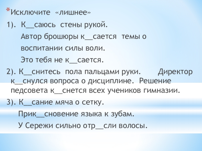 2). К__снитесь пола пальцами руки. Директор к__снулся вопроса о дисциплине. Решение педсовета к__снется всех учеников гимназии.