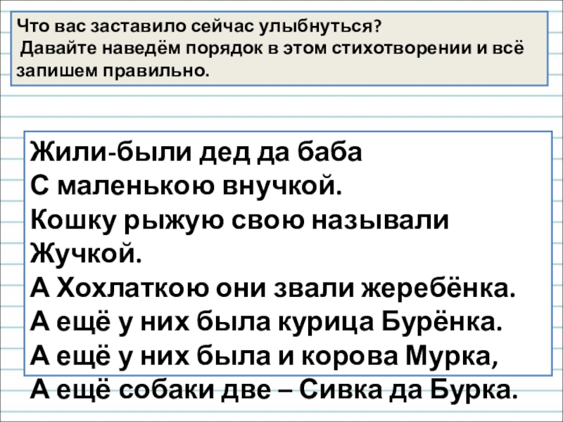 Давайте наведём порядок в этом стихотворении и всё запишем правильно.
