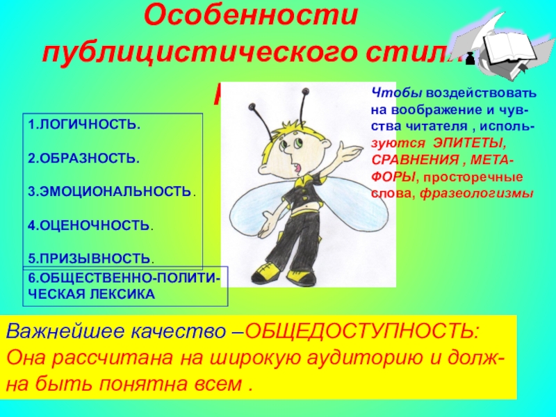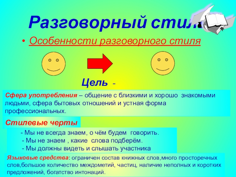Языковые средства: ограничен состав книжных слов,много просторечных