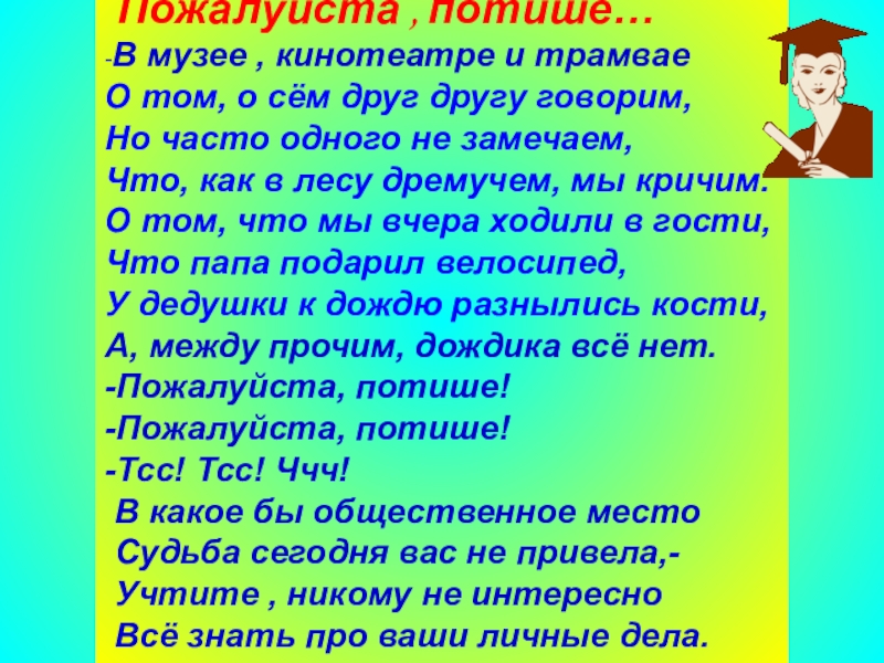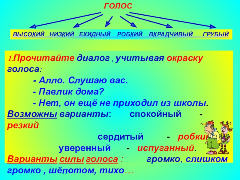 Варианты силы голоса : громко, слишком громко , шёпотом, тихо…