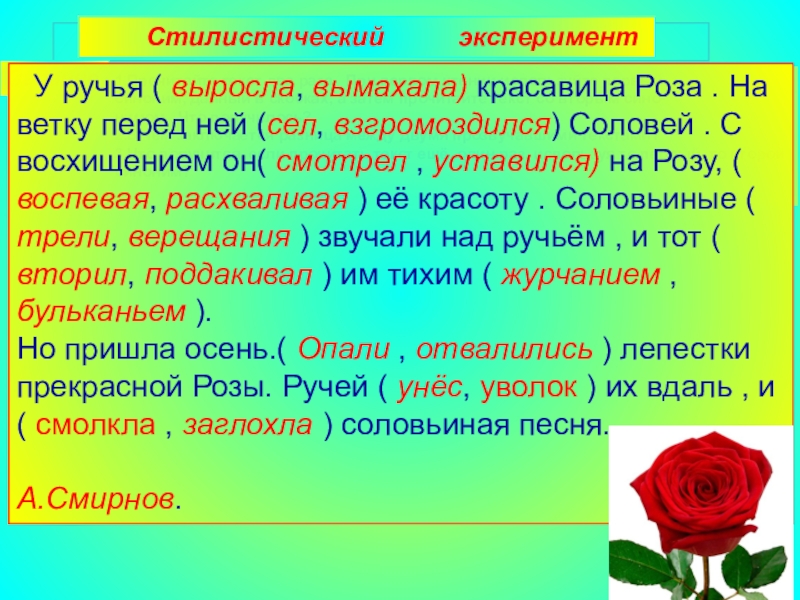 У ручья ( выросла, вымахала) красавица Роза . На ветку перед ней (сел, взгромоздился) Соловей . С восхищением он( смотрел , уставился) на Розу, ( воспевая, расхваливая ) её красоту . Соловьиные ( трели, верещания ) звучали над ручьём , и тот ( вторил, поддакивал ) им тихим ( журчанием , бульканьем ).