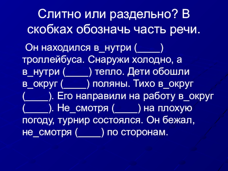 троллейбуса. Снаружи холодно, а в_нутри (____) тепло. Дети обошли в_округ (____) поляны. Тихо в_округ (____). Его направили на работу в_округ (____). Не_смотря (____) на плохую погоду, турнир состоялся. Он бежал, не_смотря (____) по сторонам.