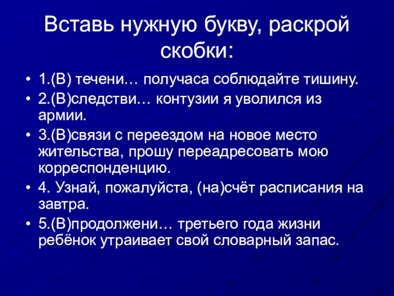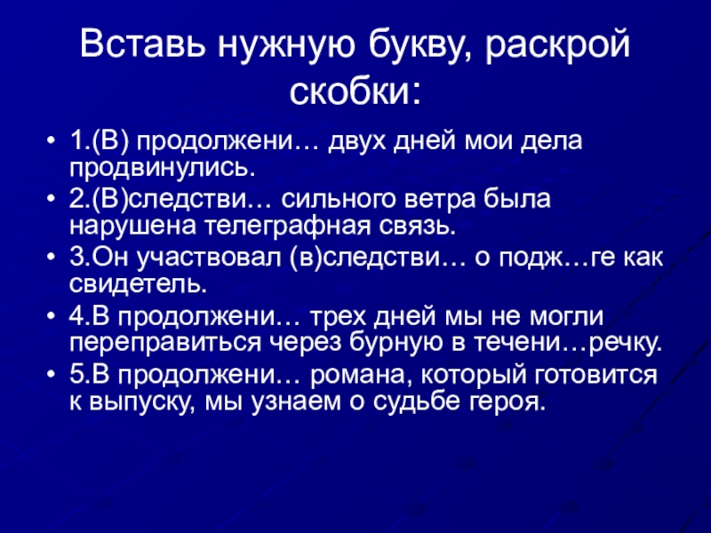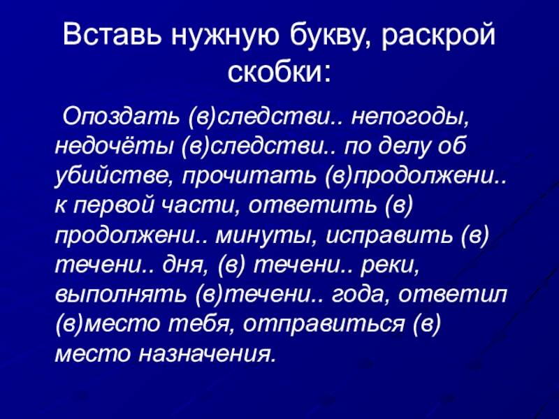об убийстве, прочитать (в)продолжени.. к первой части, ответить (в) продолжени.. минуты, исправить (в) течени.. дня, (в) течени.. реки, выполнять (в)течени.. года, ответил (в)место тебя, отправиться (в) место назначения.