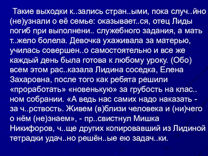 оказывает..ся, отец Лиды погиб при выполнени.. служебного задания, а мать т..жело болела. Девочка ухаживала за матерью, училась совершен..о самостоятельно и все же каждый день была готова к любому уроку. (Обо) всем этом рас..казала Лидина соседка, Елена Захаровна, после того как ребята решили «проработать» «новенькую» за грубость на клас..ном собрании. «А ведь нас самих надо наказать - за ч..рствость. Живем (в)близи человека и (ни)чего о нём (не)знаем», - пр..свистнул Мишка Никифоров, ч..ще других копировавший из Лидиной тетрадки удач..но решён..ые ею задач..ки.