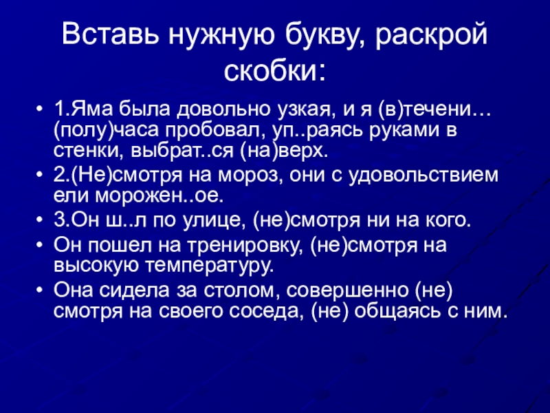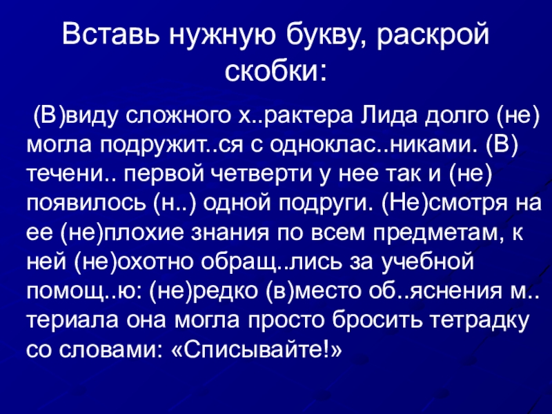 Слайд 6Вставь нужную букву, раскрой скобки: