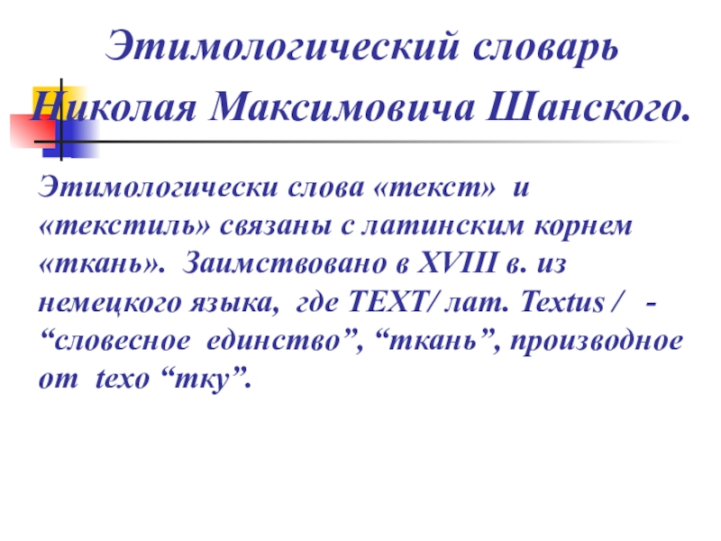 Этимологически слова «текст» и «текстиль» связаны с латинским корнем «ткань». Заимствовано в ХVIII в. из немецкого языка, где ТЕХТ/ лат. Textus / - “словесное единство”, “ткань”, производное от texo “тку”.