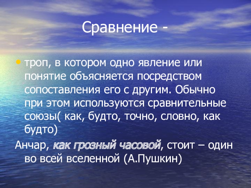 котором одно явление или понятие объясняется посредством сопоставления его с другим. Обычно при этом используются сравнительные союзы( как, будто, точно, словно, как будто)