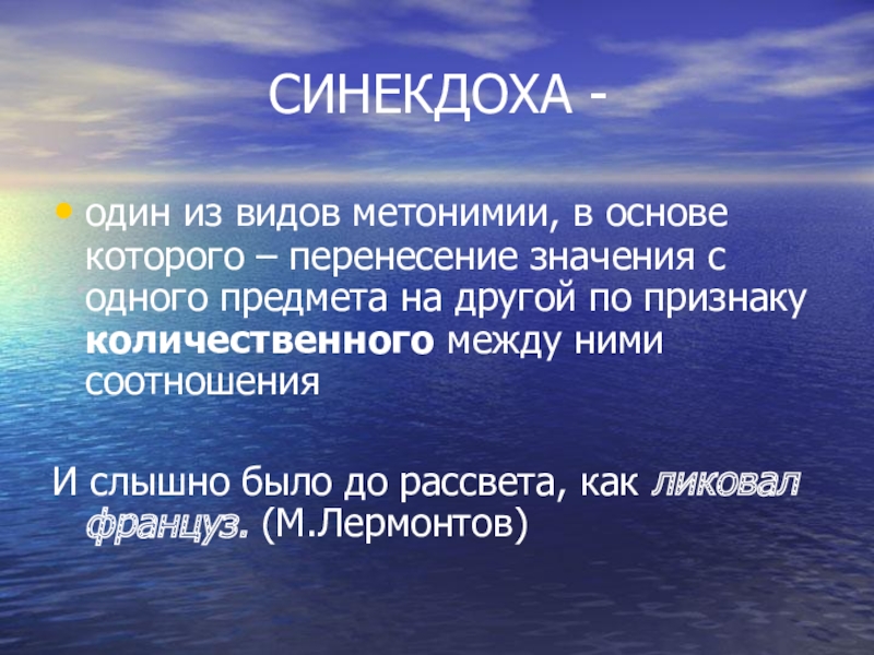 видов метонимии, в основе которого – перенесение значения с одного предмета на другой по признаку количественного между ними соотношения