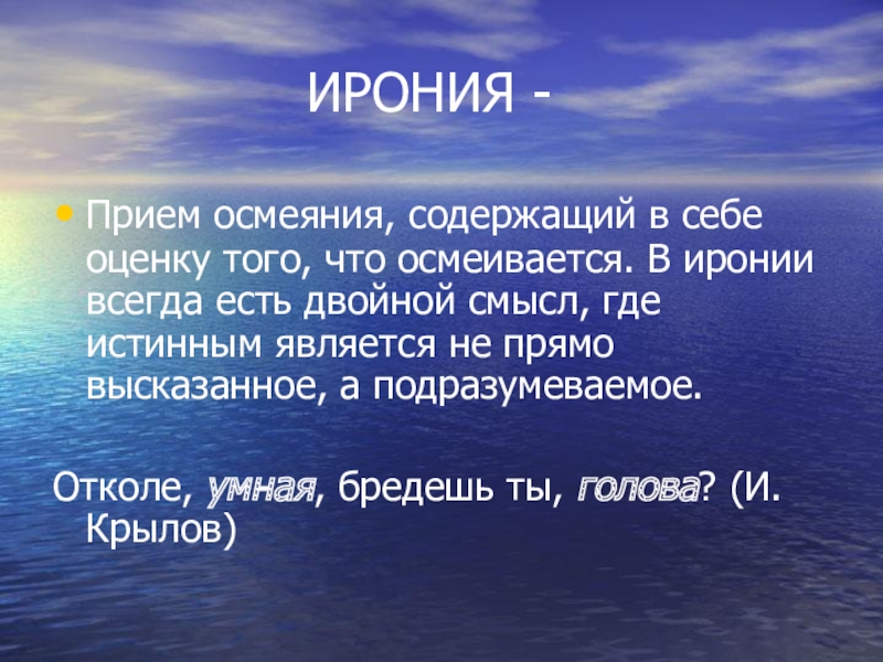 осмеяния, содержащий в себе оценку того, что осмеивается. В иронии всегда есть двойной смысл, где истинным является не прямо высказанное, а подразумеваемое.