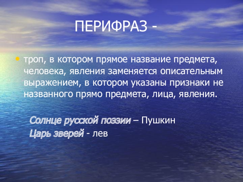 котором прямое название предмета, человека, явления заменяется описательным выражением, в котором указаны признаки не названного прямо предмета, лица, явления.