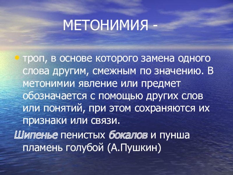 которого замена одного слова другим, смежным по значению. В метонимии явление или предмет обозначается с помощью других слов или понятий, при этом сохраняются их признаки или связи.