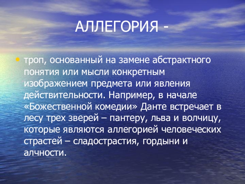 на замене абстрактного понятия или мысли конкретным изображением предмета или явления действительности. Например, в начале «Божественной комедии» Данте встречает в лесу трех зверей – пантеру, льва и волчицу, которые являются аллегорией человеческих страстей – сладострастия, гордыни и алчности.