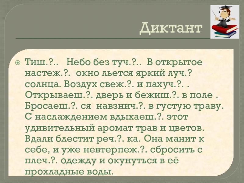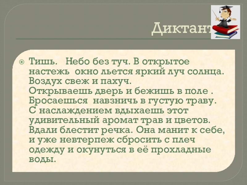 Открываеш.?. дверь и бежиш.?. в поле . Бросаеш.?. ся навзнич.?. в густую траву. С наслаждением вдыхаеш.?. этот удивительный аромат трав и цветов. Вдали блестит реч.?. ка. Она манит к себе, и уже невтерпеж.?. сбросить с плеч.?. одежду и окунуться в её прохладные воды.