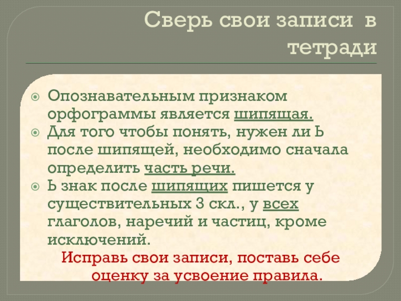 Исправь свои записи, поставь себе оценку за усвоение правила.