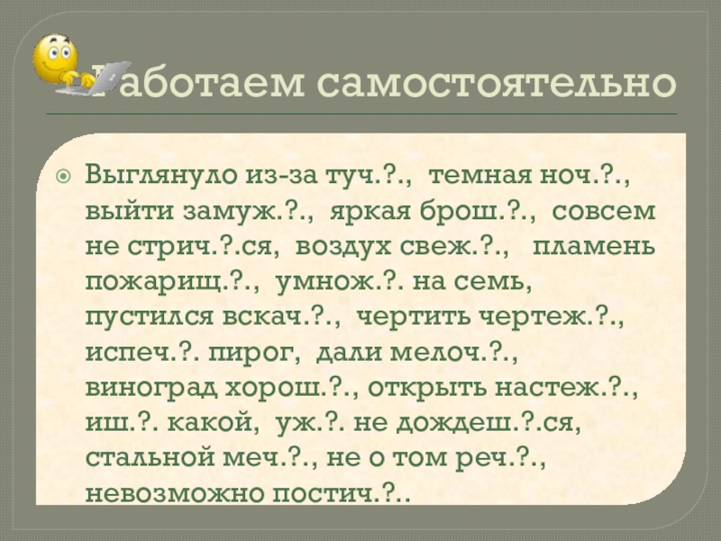 Выглянуло из-за туч.?., темная ноч.?., выйти замуж.?., яркая брош.?., совсем
