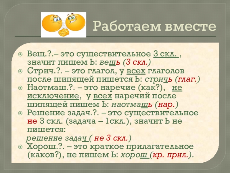 Напоминаем вопрос: что необходимо определить в первую очередь, чтобы понять, писать Ь после шипящей или нет?