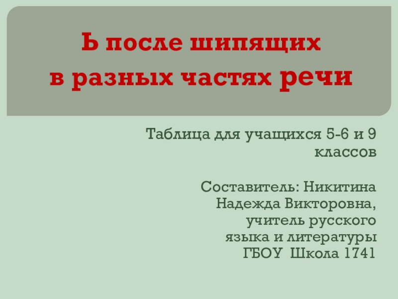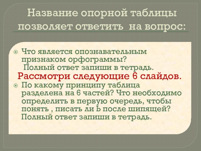 По какому принципу таблица разделена на 6 частей? Что необходимо определить в первую очередь, чтобы понять , писать ли Ь после шипящей?