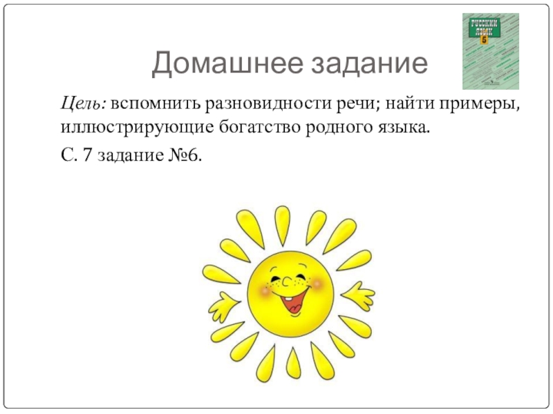 Домашнее заданиеЦель: вспомнить разновидности речи; найти примеры, иллюстрирующие богатство родного языка.С. 7 задание №6.