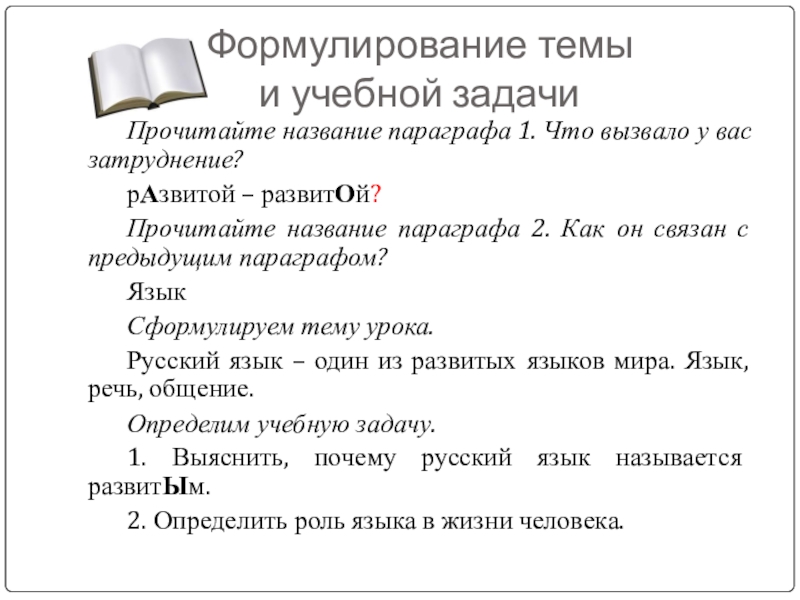 Формулирование темы и учебной задачиПрочитайте название параграфа 1. Что вызвало у вас затруднение?рАзвитой – развитОй?Прочитайте название параграфа 2. Как он связан с предыдущим параграфом?ЯзыкСформулируем тему урока.Русский язык – один из развитых языков мира. Язык, речь, общение.Определим