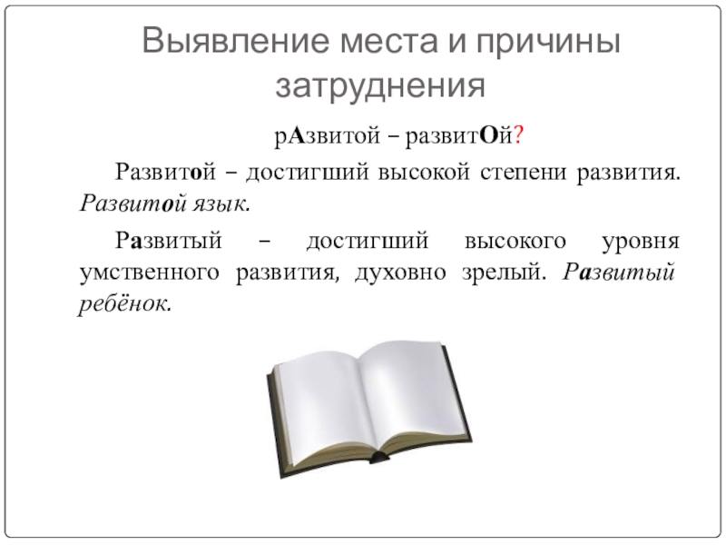 Выявление места и причины затруднениярАзвитой – развитОй?Развитой – достигший высокой степени развития. Развитой язык.Развитый – достигший высокого