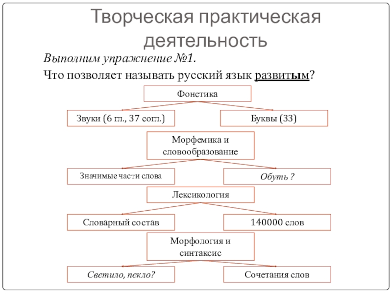 Творческая практическая деятельностьВыполним упражнение №1.Что позволяет называть русский язык развитым?