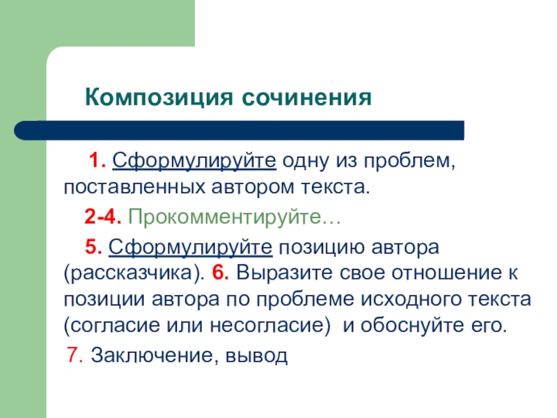 5. Сформулируйте позицию автора (рассказчика). 6. Выразите свое отношение к позиции автора по проблеме исходного текста (согласие или несогласие) и обоснуйте его.