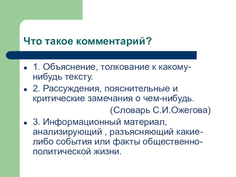3. Информационный материал, анализирующий , разъясняющий какие-либо события или факты общественно-политической жизни.