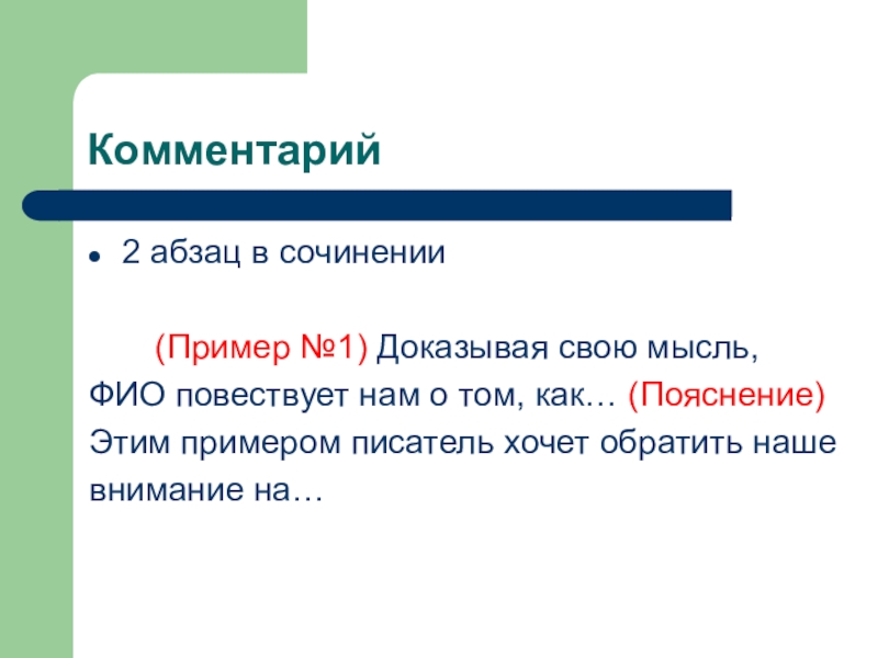 примером, важным для понимания проблемы, могут служить слова автора (рассказчика): «______». (Пояснение) ФИО хочет донести до читателя мысль о том, что…