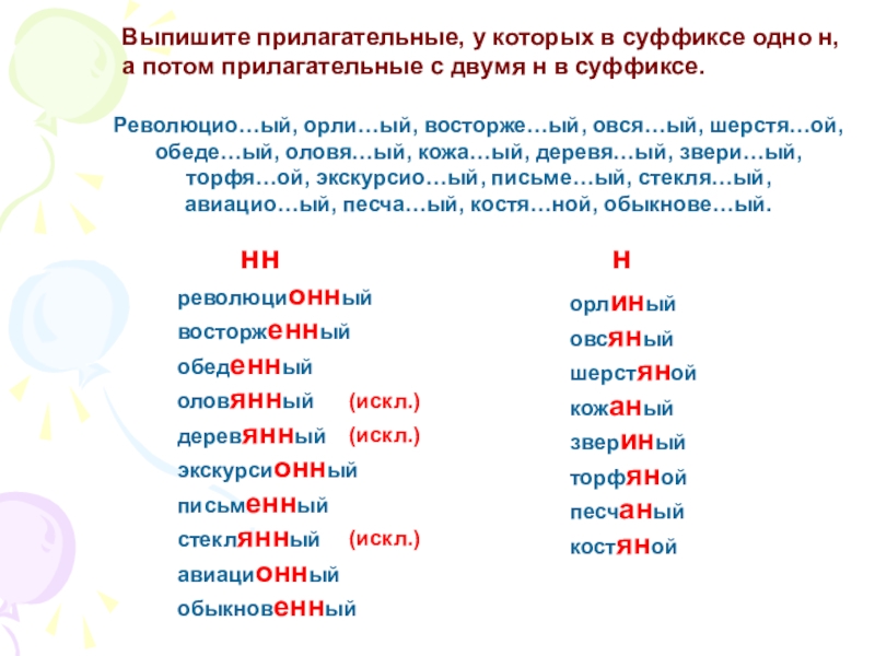 Революцио…ый, орли…ый, восторже…ый, овся…ый, шерстя…ой, обеде…ый, оловя…ый, кожа…ый, деревя…ый, звери…ый, торфя…ой, экскурсио…ый, письме…ый, стекля…ый, авиацио…ый, песча…ый, костя…ной, обыкнове…ый.