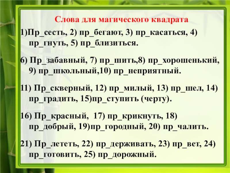 16) Пр_красный, 17) пр_крикнуть, 18) пр_добрый, 19)пр_городный, 20) пр_чалить.