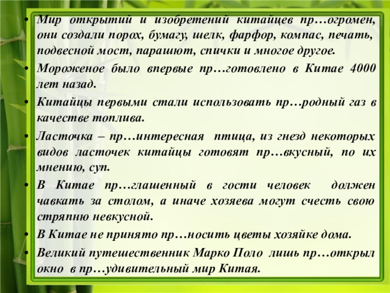 Великий путешественник Марко Поло лишь пр…открыл окно в пр…удивительный мир Китая.