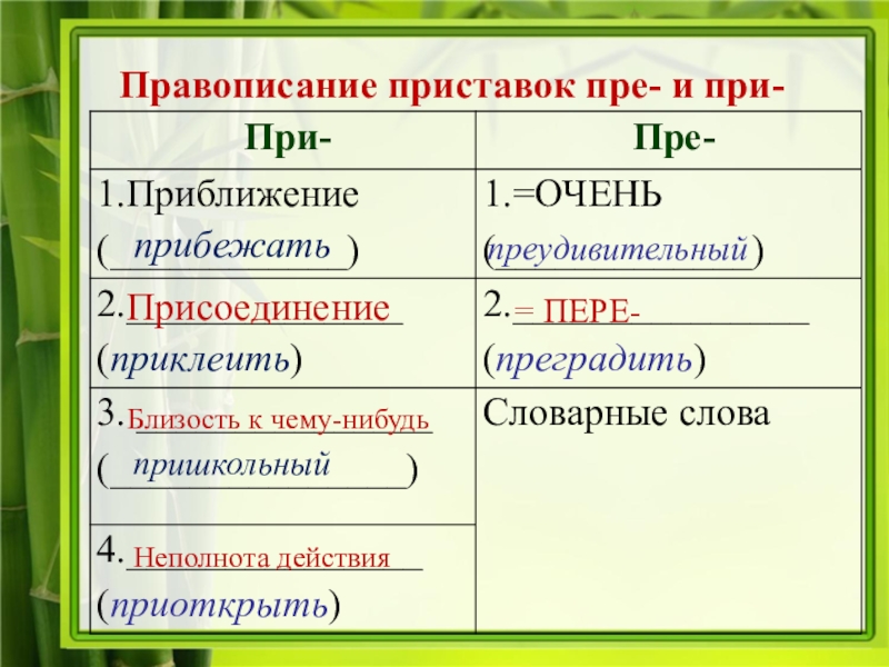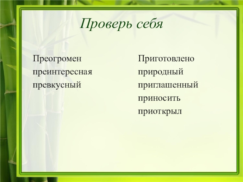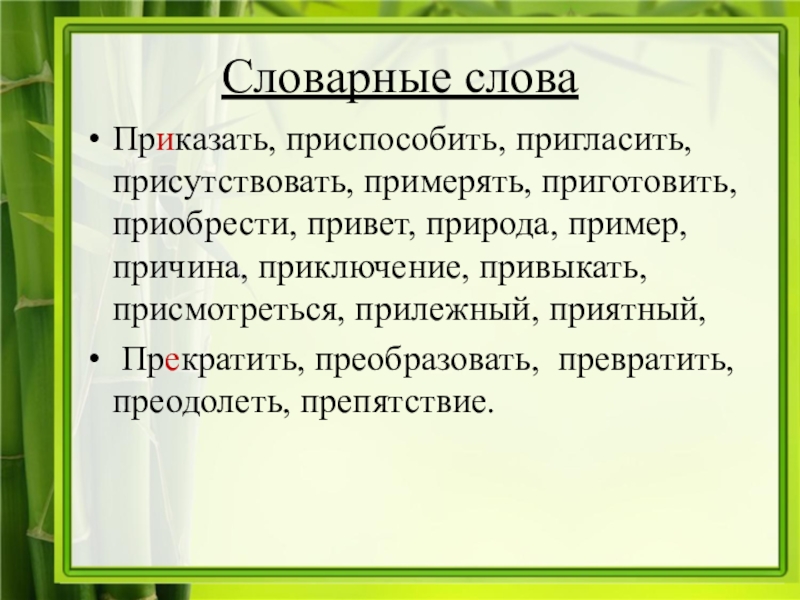 Приказать, приспособить, пригласить, присутствовать, примерять, приготовить, приобрести, привет, природа, пример,