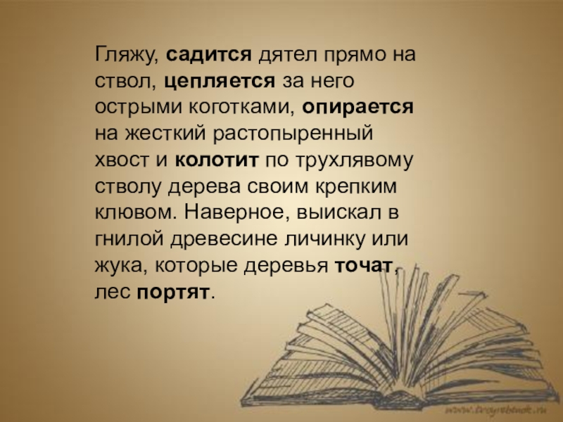 Гляжу, садится дятел прямо на ствол, цепляется за него острыми коготками, опирается на жесткий растопыренный хвост и колотит по трухлявому стволу дерева своим крепким клювом. Наверное, выискал в гнилой древесине личинку или жука, которые деревья точат, лес портят.