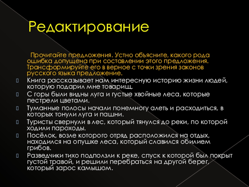 Редактирование     Прочитайте предложения. Устно объясните, какого рода ошибка допущена при составлении этого предложения.