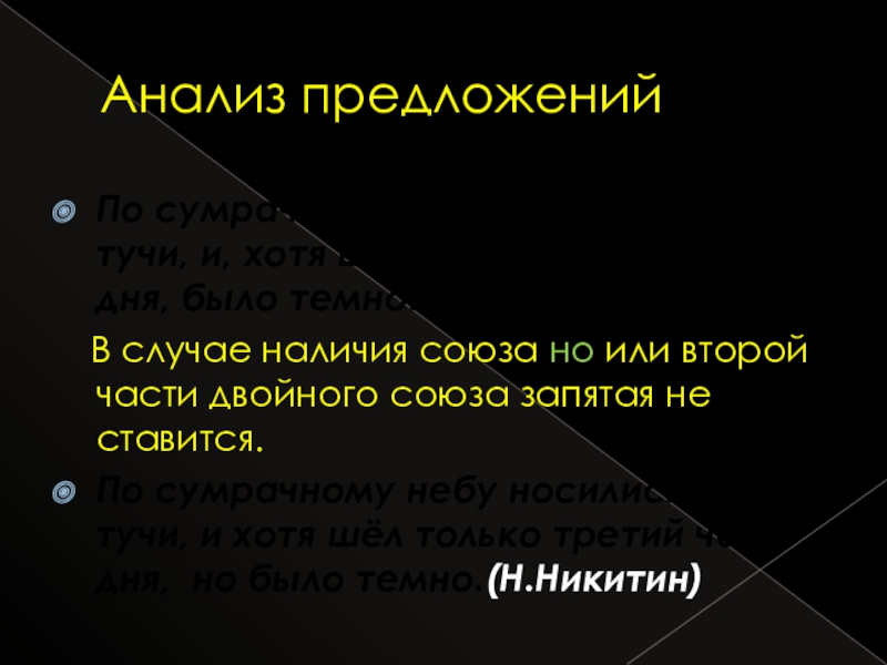 По сумрачному небу носились густые тучи, и хотя шёл только третий час дня, но было темно.(Н.Никитин)