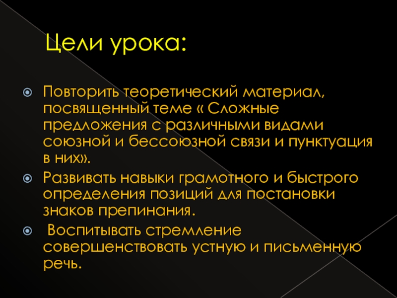 Цели урока:Повторить теоретический материал, посвященный теме « Сложные предложения с различными видами союзной и бессоюзной связи и пунктуация в них».Развивать навыки грамотного и быстрого определения позиций для постановки знаков препинания. Воспитывать стремление совершенствовать устную и письменную