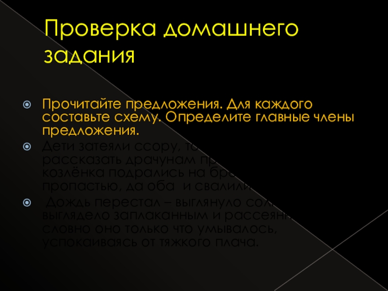 Проверка домашнего      заданияПрочитайте предложения. Для каждого составьте схему. Определите главные члены предложения.Дети