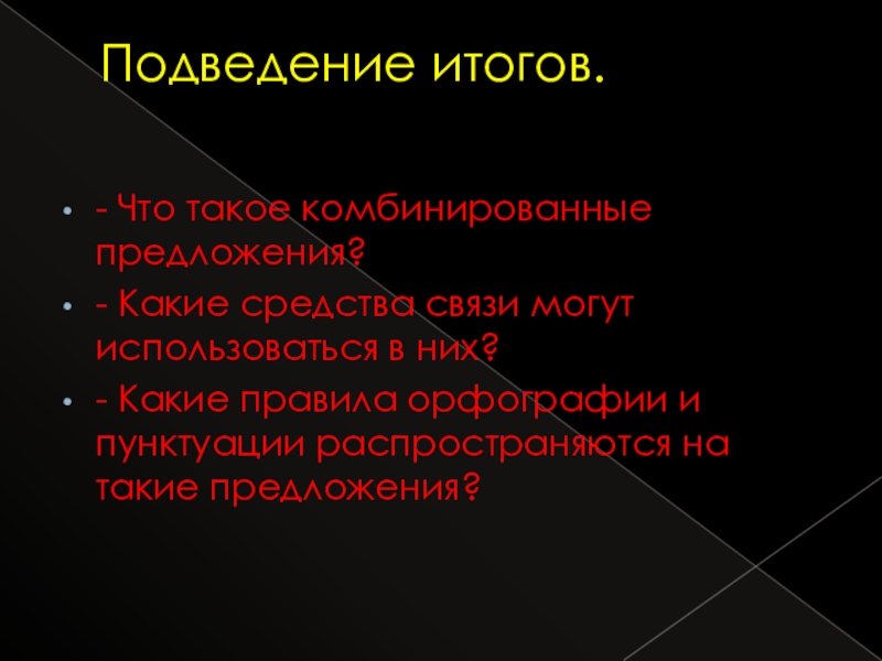 Подведение итогов. - Что такое комбинированные предложения?- Какие средства связи могут использоваться в них?- Какие правила орфографии