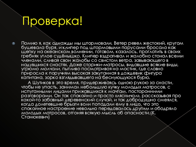 Проверка!Помню я, как однажды мы штормовали. Ветер ревел жестокий, кругом бушевала буря, и клипер под штормовыми парусами