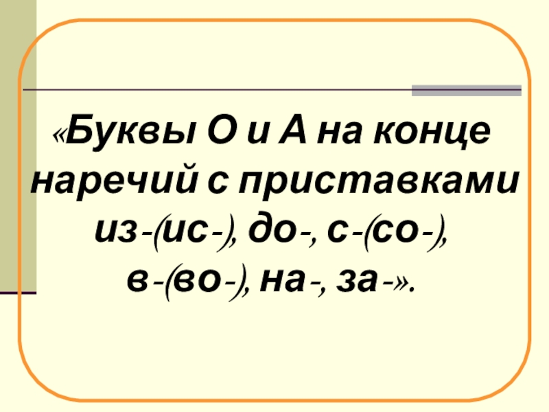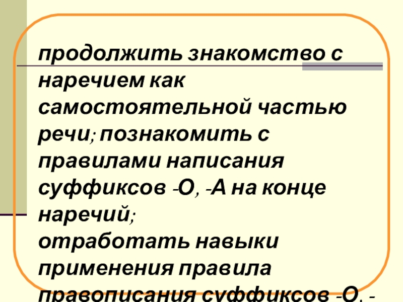 продолжить знакомство с наречием как самостоятельной частью речи; познакомить с правилами написания суффиксов -О, -А на конце наречий;